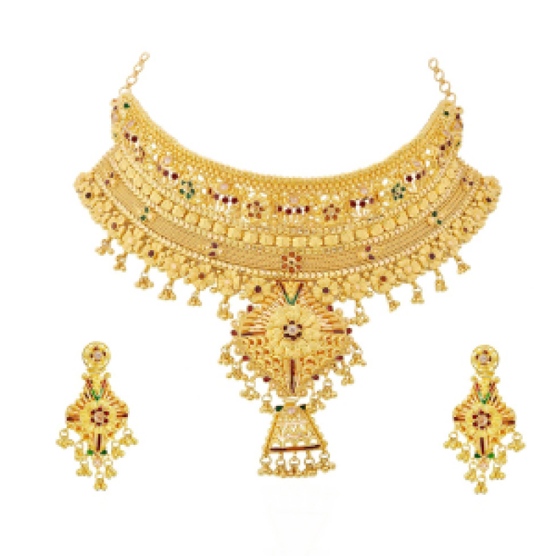 This stunning 22K Gold Necklace Set is the perfect addition to your jewelry collection. The necklace features a beautiful floral design with intricate details and colorful enamel work. The earrings are equally beautiful, matching the necklace perfectly. This set is sure to turn heads wherever you go.